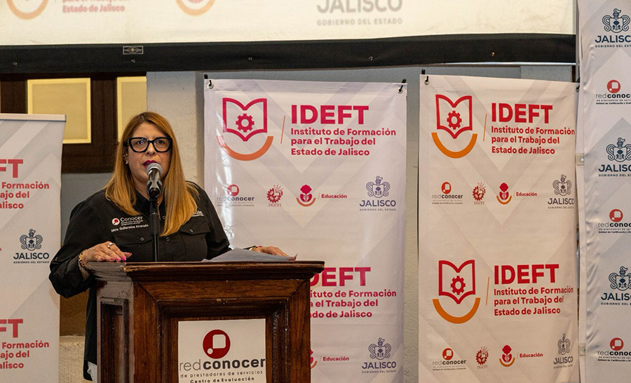 Guillermina Alvarado Moreno, directora general del CONOCER, destacó la importancia de este acto como parte de la Estrategia Nacional de Certificación de Competencias Laborales impulsada por el gobierno federal y respaldada en Jalisco por el gobernador Pablo Lemus. Reconoció el liderazgo del IDEFT y de su director, Salvador Cosío, por su compromiso en profesionalizar el talento local y generar estándares alineados a las necesidades productivas del Estado. Subrayó que la certificación de competencias dignifica saberes históricos, promueve la justicia social y fortalece la productividad con enfoque regional. Anunció que desde Jalisco se desarrollarán estándares en electromovilidad, inteligencia artificial, semiconductores, lengua de señas, entre otros, e hizo un llamado a seguir trabajando en conjunto por un México más justo, competitivo y preparado.
