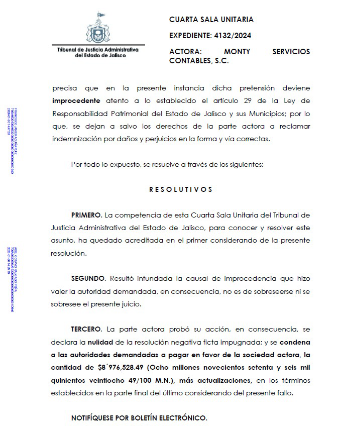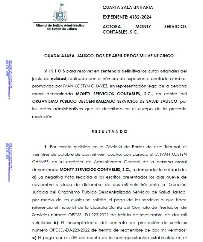 No obstante, Monty Servicios Contables, S.C. tuvo que recurrir al Tribunal de Justicia Administrativa para conseguir que Servicios de Salud Jalisco le pagara el 50 por ciento del contrato que le fue asignado.