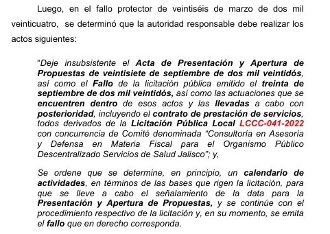 El Juzgado Cuarto de Distrito en Materia Administrativa, le acaba de otorgar un plazo de tres días al Organismo Público Descentralizado (OPD) Servicios de Salud Jalisco, para que acate una sentencia de amparo que anula un fallo, un contrato y ordena que se reponga la polémica licitación realizada en septiembre de 2022.