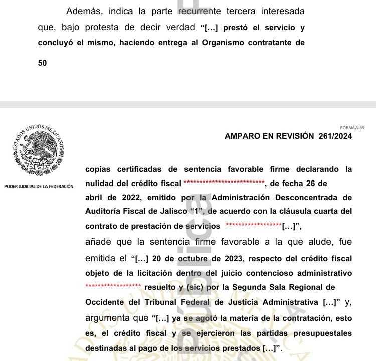 Dentro de los alegatos en el juicio de amparo en revisión 261/2024, la empresa ganadora de la licitación Monty Servicios Contables, S.C., sostuvo que prestó el servicio y concluyó el mismo, haciendo entrega al organismo contratante de copias certificadas de la sentencia favorable que declaraba la nulidad del crédito fiscal.