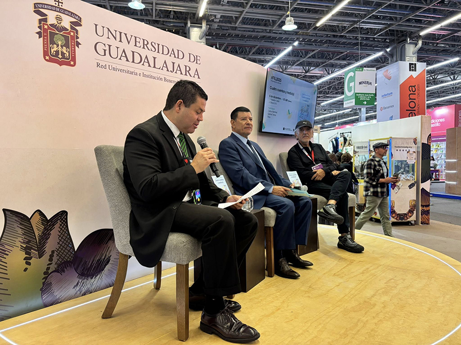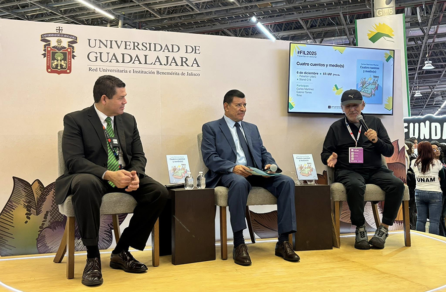 El director de Canal 44 y Radio U de G, Gabriel Torres Espinoza, fue el responsable de la presentación de la obra y señaló que los cuatro cuentos, que en realidad son cinco, no solo cuentan historias, sino que las retuercen en esa insistencia que tienen los periodistas para darle sentido a las cosas.